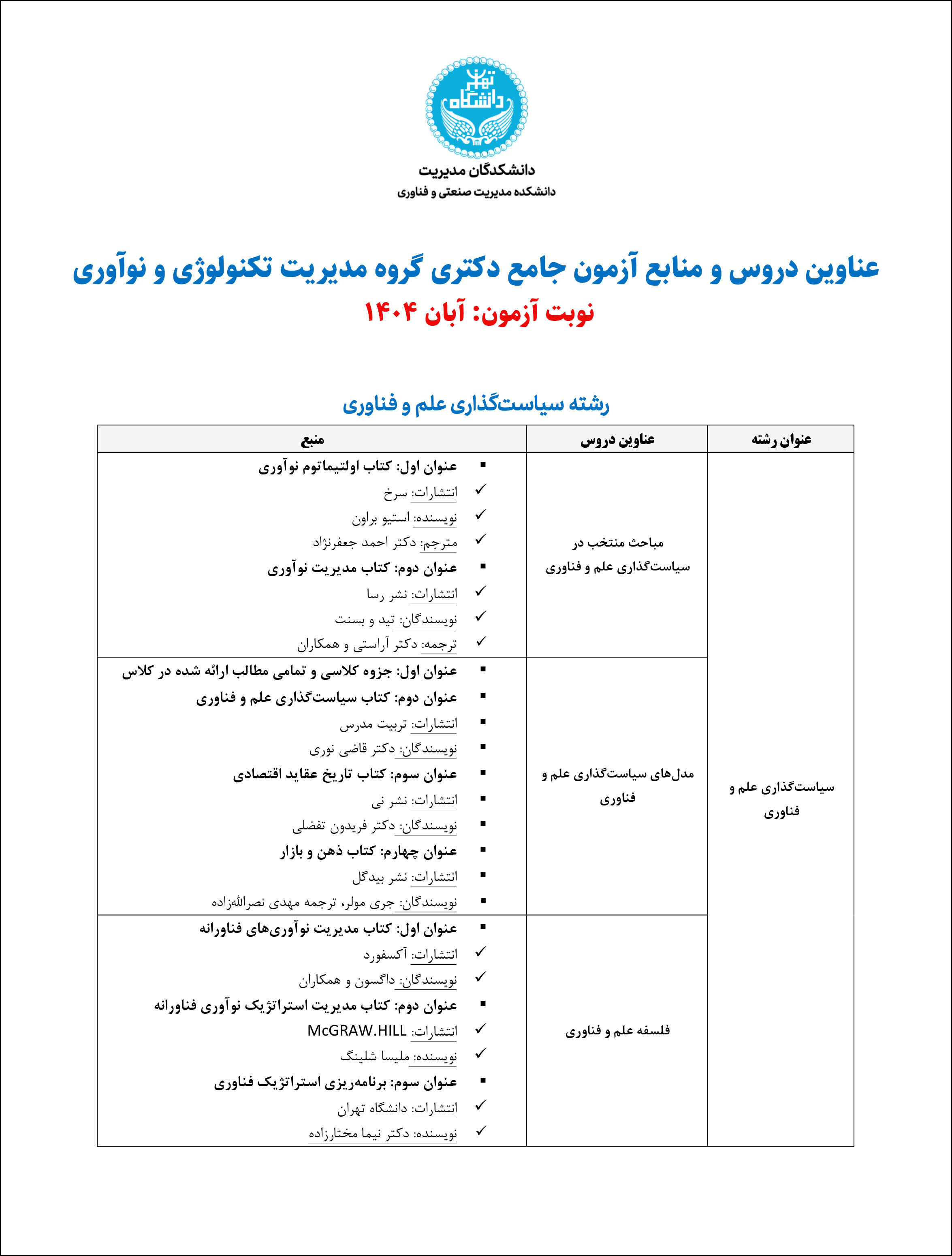- گروه مدیریت تکنولوژی و نوآوری - گرایش سیاستگذاری علم و فناوری